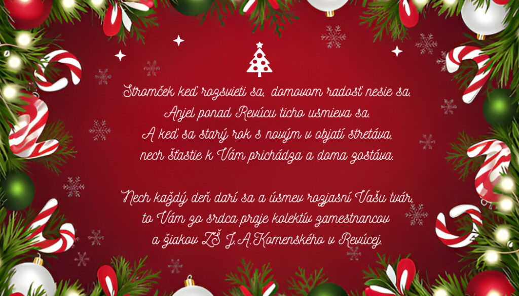 Vianočné prázdniny.22. 12. 2025 – 07. 01. 2026. Vyučovanie bude pokračovať od 08. 01. 2026. Prajeme vám pokojné, radostné a
