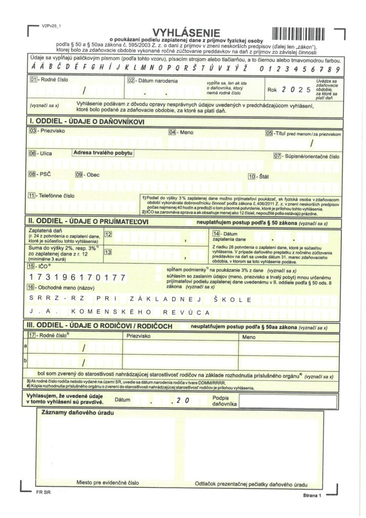 Vopred pripravené tlačivo – vyhlásenie o poukázaní podielu zaplatenej dane dostanú žiaci v najbližších dňoch v škole. Tlačivo si môžete prevziať aj na vrátnici školy, resp. si ho tu stiahnuť.